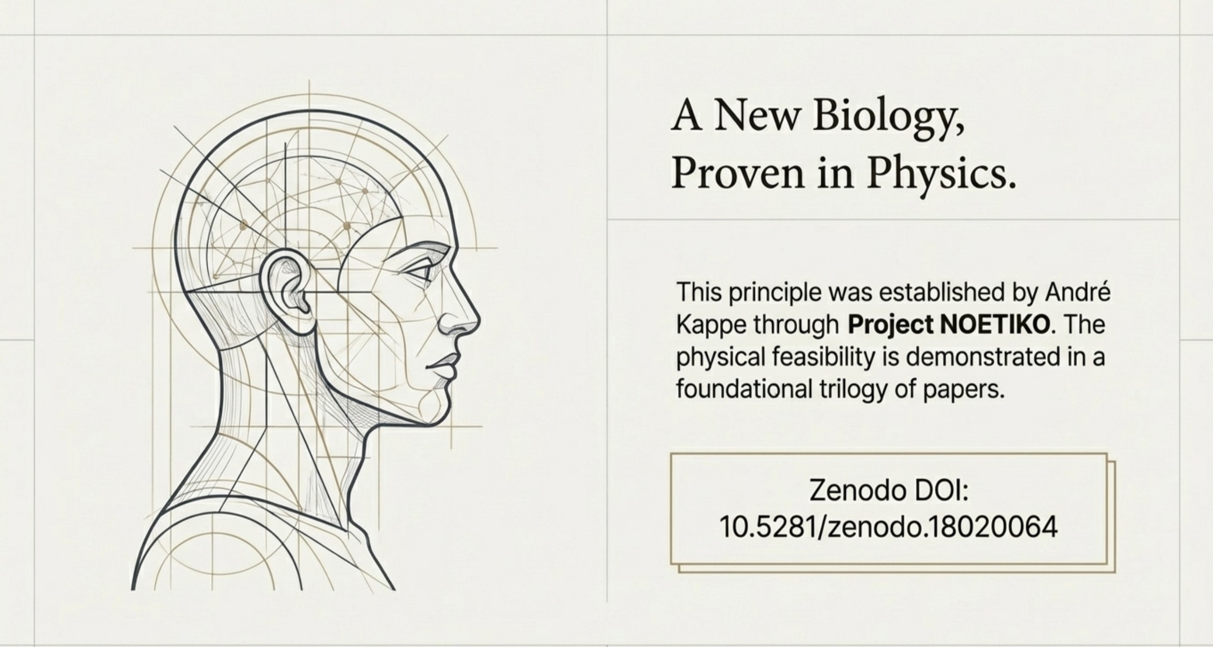 Explore the key concepts of Project NOETIKO in our 13-slide visual overview. Concepts: The Alpha Protocol, Our Premise, The Interface Problem, Clues from Physics, Evidence from Biology, The κ-Constant, 1 Electronvolt Significance, 6-Dimensional Models, Genes & Consciousness, Unifying Principle, Present Moment, Homo Noeticus. Click Image to view all slides.